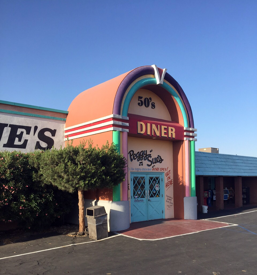 We have left the bright lights of Las Vegas and heading for the last part of our journey to Los Angeles in California. The journey was a long painfully slow drive due to the Easter holiday traffic so we have been told. During the trip, we decided to stop of for something to eat at the legendary Peggy Sue’s. Peggy Sue’s is an original roadside Diner, built in 1954 with 9 counter stools and 3 booths. It is set in the shadow of the Calico Mountains and was built from railroad ties and mortar from the nearby Union Pacific Rail yard. Peggy has used her grandmothers recipes for the authentic 50’s food. The have even built their own Diner-saur park with sculptures of dinosaurs, water falls, fountains grass and trees to have a wonder through. The inside is dedicated to all sorts of movie and music memorabilia and is an essential stop of point, if only for the atmosphere.