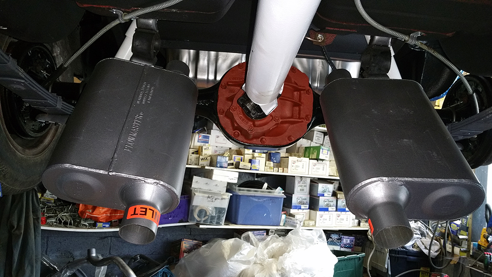 We are turning our attention to the full restoration ’66 Coupe again this coming week, we have had a couple of dry run of fittings of the exhaust to her during the past week. We are having to custom build this exhaust to fit the big 3″ headers that it already has. The bore of the pipe we are using is the recommended big maximum of 2 1/4″ pipes into Twin Flowmaster 40 Series Delta Flow muffler boxes.