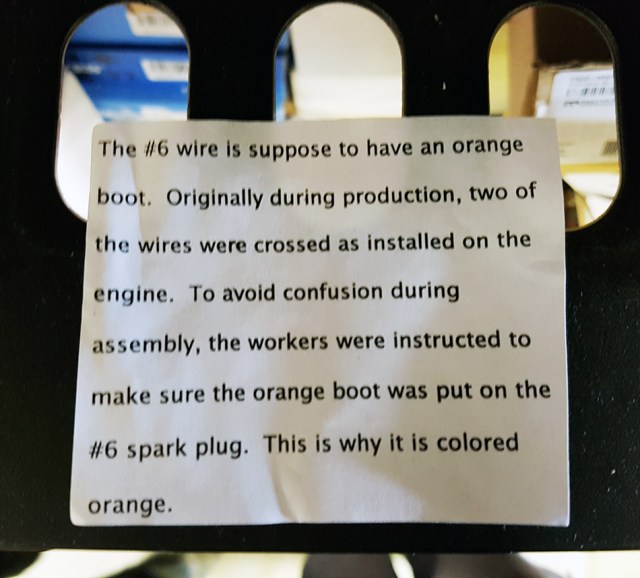 The insert confirms what Adam had just been explaining. “During the production line process a number of engines had a miss fire straight from the line. Ford launched an immediate investigation and it was later found that the workers had swapped the fifth and sixth cylinder leads around the wrong way. Needless to say this caused Ford multiple delays on the production line as well as having to fix the relatively simple error. Like all things, the simple answer was to identify the correct wire. So the Orange boot was created to cure the problem, which it did instantly with the very first cars with the new system rolling of the production line, no more misfires.”