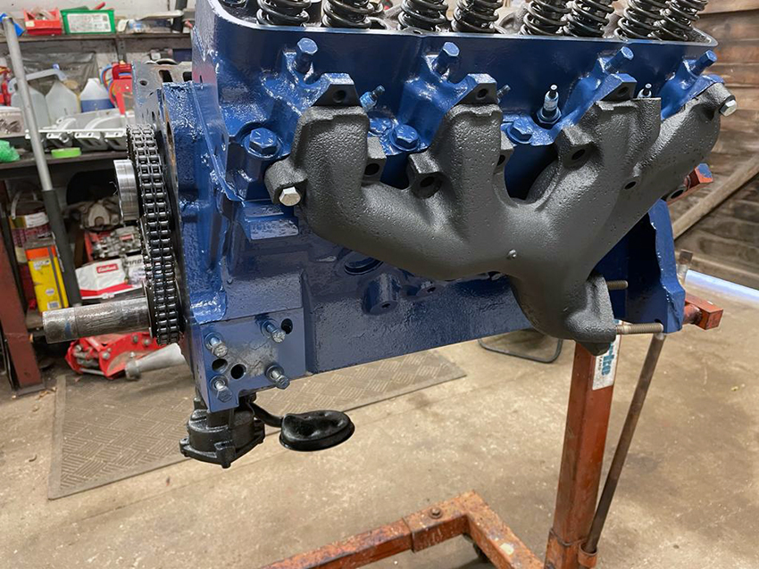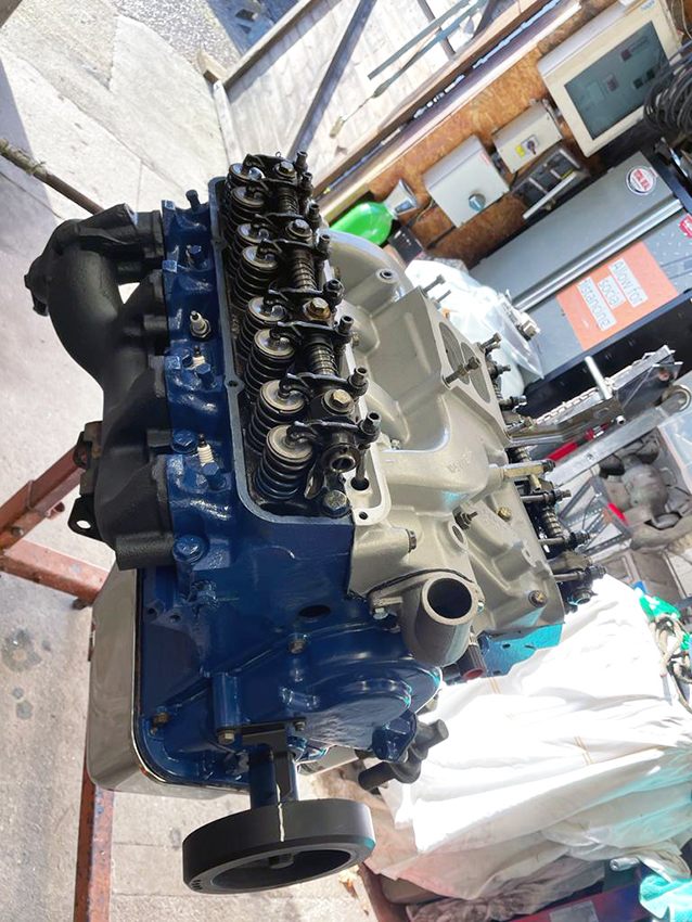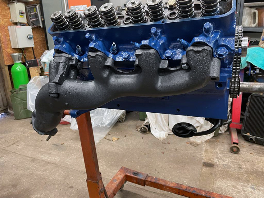 The engine was stripped down with the manifolds removed, blasted and coated, new sump and water pump. The engine was painted with contrasting exhaust manifolds.