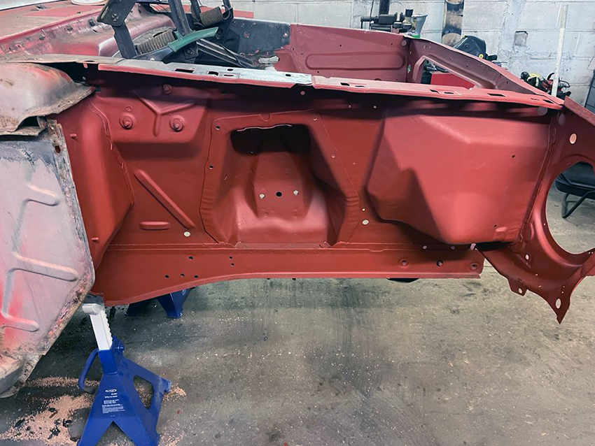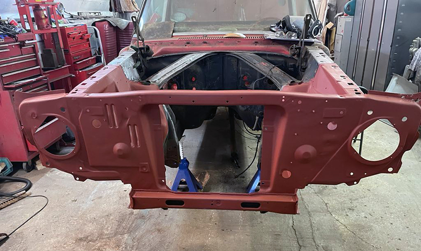 We have been working on the ’65 Ranchero where the front end has been repaired and given a coating of the stock red lead oxide paint.