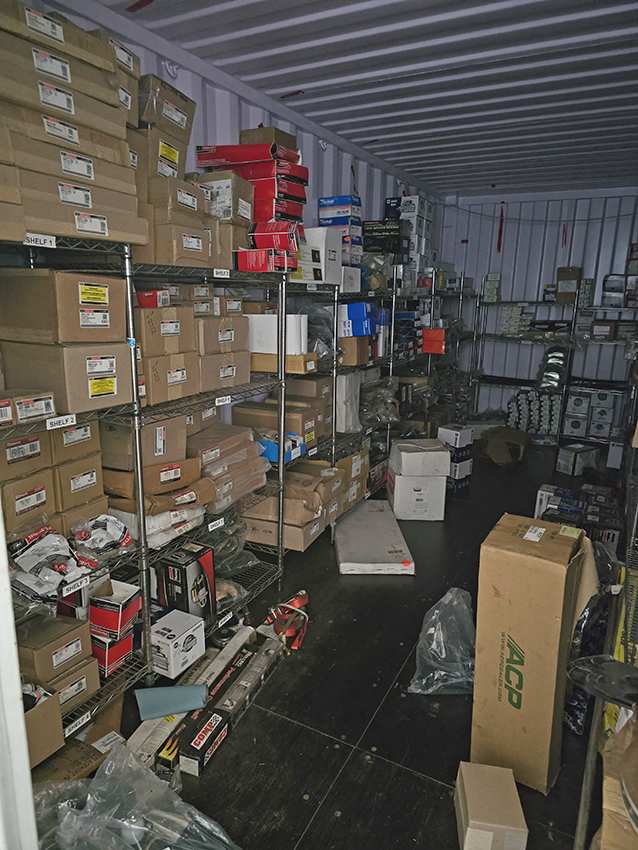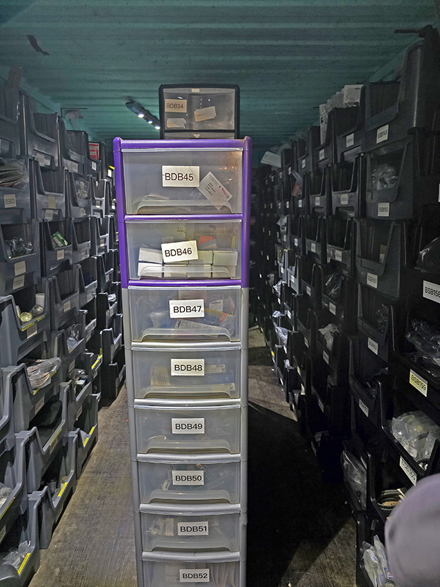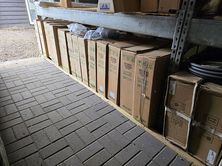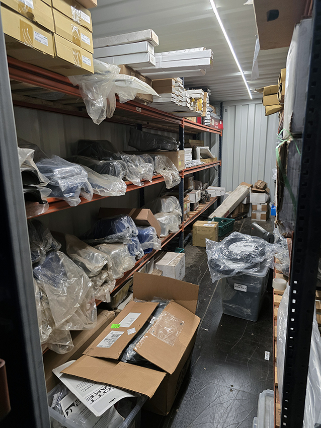 Just a few of the containers with the remaining stock going in. We have a new stock of radiators and some consumable sundries as well, we think Adam may have over ordered to fill the latest delivery pallet up. All our sheet metal is housed elsewhere in a controlled environment where we have a much bigger storage areas to pick the panels when we need them.