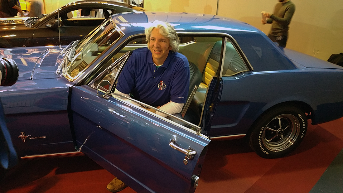 Photos taken of Edd China from the TV show “Wheeler Dealers” sitting in Mart’s Acapulco Blue ’66 Coupe at the MOCGB stand.