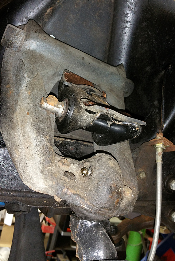 With the shock out you can lift the car up to easily get to the springs. With a spring compressor in place, wind the mechanism to compress the springs smaller so they can be lifted out of the spring perch. At Mustang Maniac we have designed out own unique tool which is far superior to the shop bought ones for use on Mustangs. The custom levers at the bottom are spaced for the coils and the top has a thick plate that takes the pressure on top of the shock tower with the various holes for various years to hold it in place.