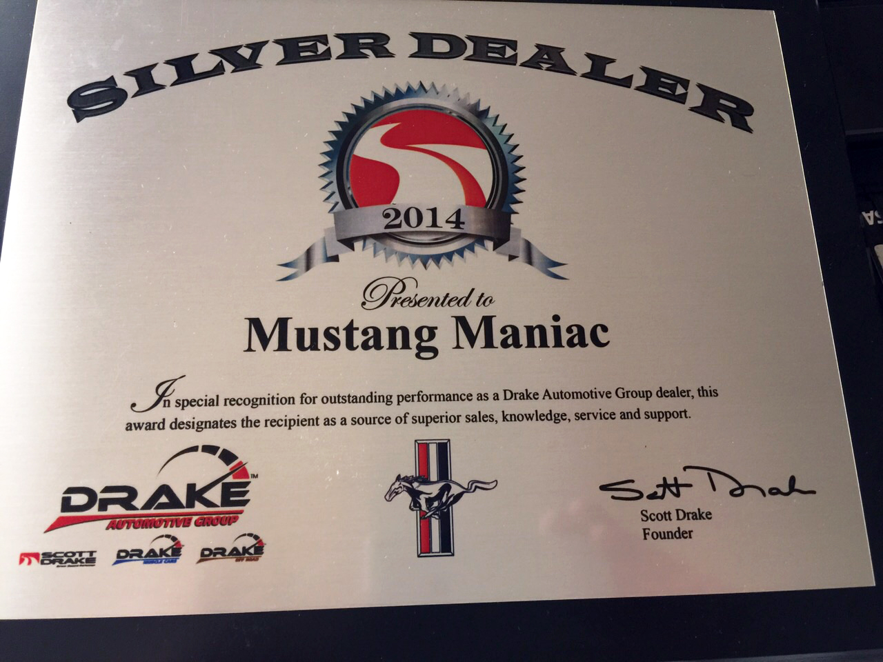 Scott presented Mustang Maniac another Silver Award for 2014 which we were honoured to accept and will place alongside our other awards from Scott Drake.